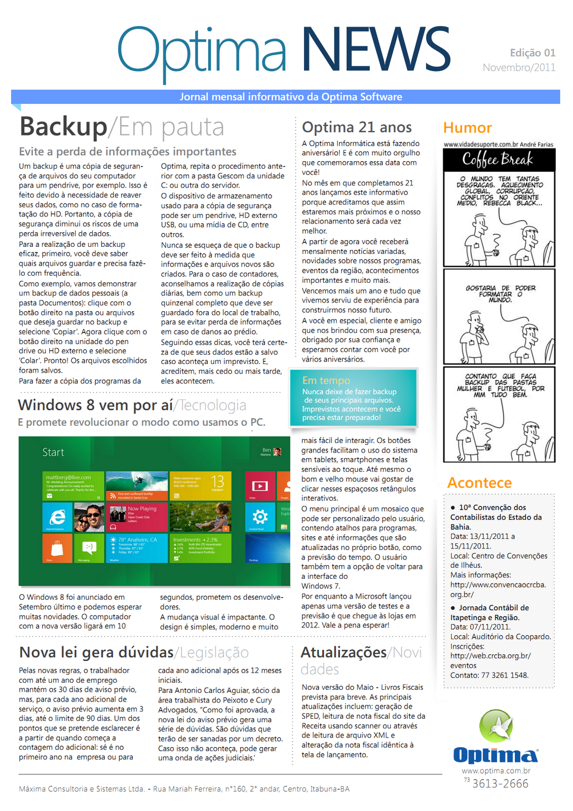 A Optima acaba de lançar seu informativo mensal, o ‘Optima News’, trazendo novidades, eventos, dicas, humor e orientações, sobre a área contábil, financeira e tecnológica.